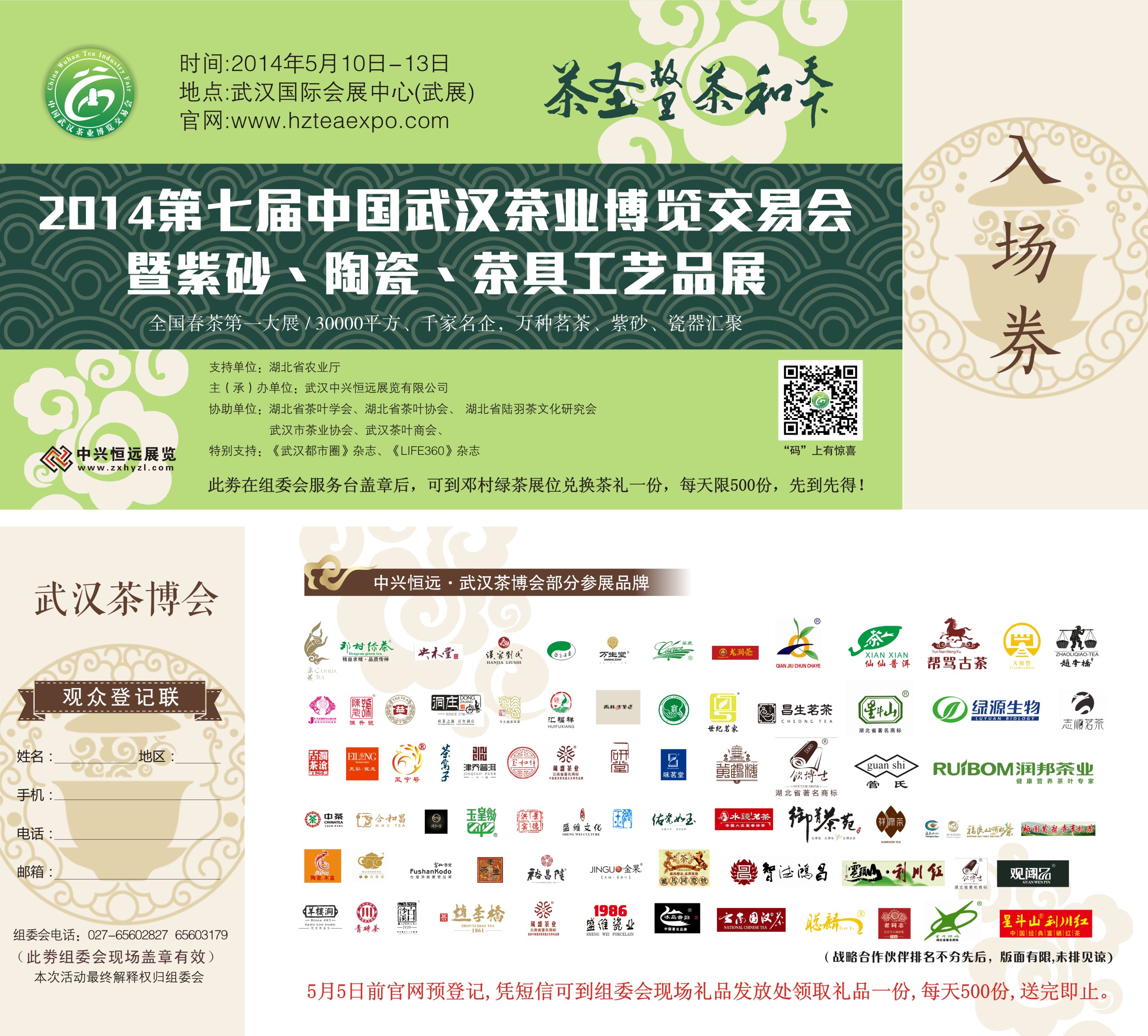 茶圣故里,茶和天下。2014第七届中国武汉茶业博览交易会(春季展)即将于下月10日-13日在武汉国际会展中心(汉口武展)耀世启幕!30000平方米、1500个展位的超大规模,来自国内外的700余家企业参展,上万种名茶、紫砂、瓷器茶具汇聚。展会前期参观预登记及抢票工作现已全面开启,届时预登记和持票参观的观众将可获得组委会或商家提供的精致礼品一份,欢迎广大茶友登录武汉茶博会官网(www.hzteaexpo.com)预登记或到武汉茶博会各战略合作单位门店免费索取门票参观领礼!
