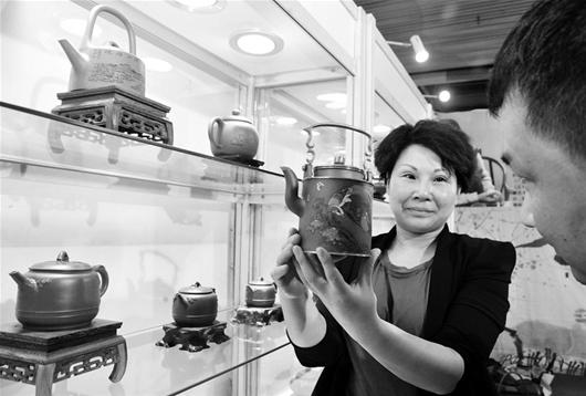 记者在茶博会的紫砂展区,看到了来自宜兴的勇丽琴等100多位紫砂工艺美术师的作品。有22年从业经历的勇丽琴称紫砂的创作很多来自“灵感的火花”。她说,真正好的紫砂有艺术收藏价值,器皿有张力厚重感,整体协调流畅,使得喝茶玩壶成为一种艺术享受。勇丽琴制作的井栏、梁祝等作品目前已升值到数万元。