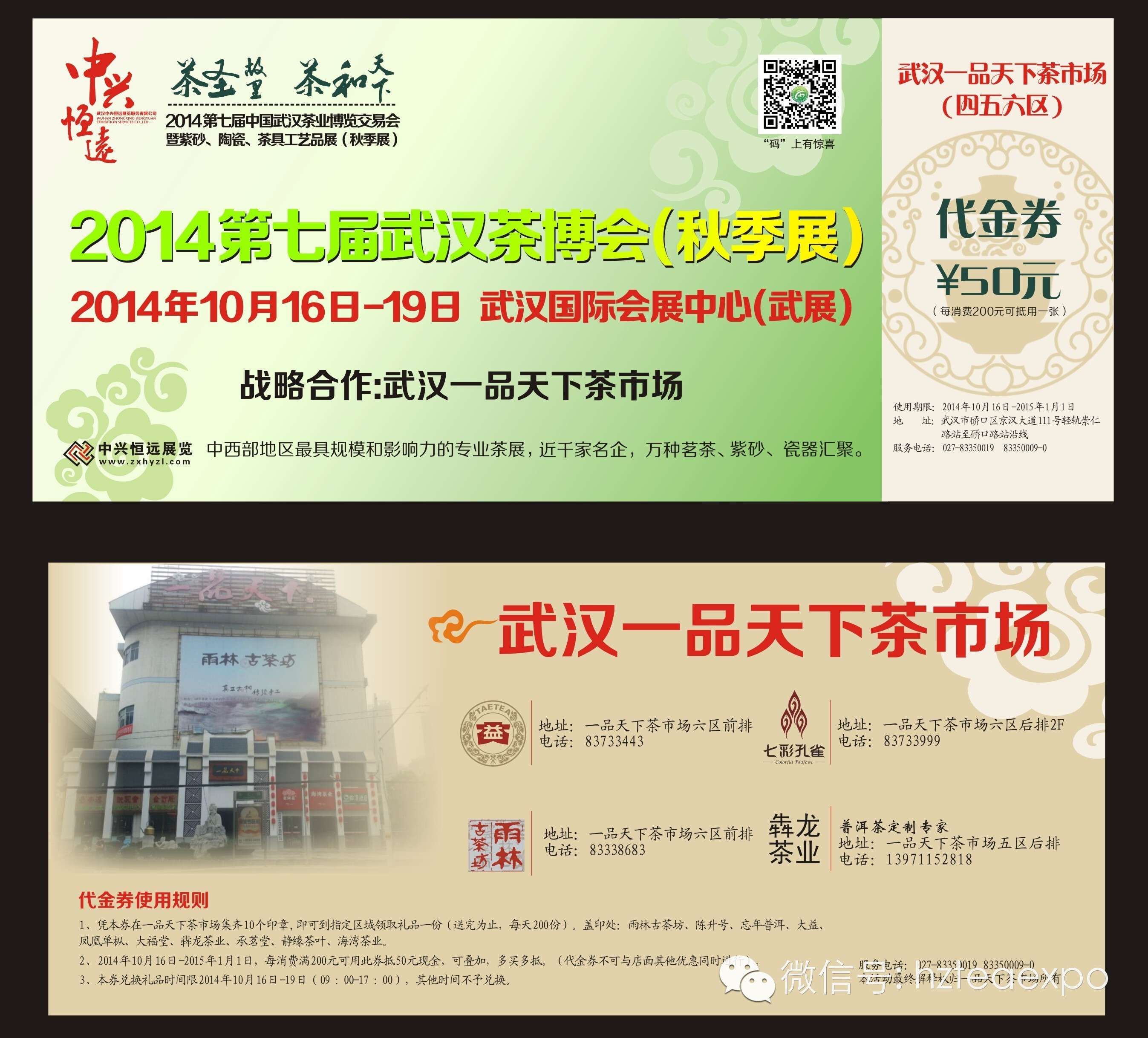 另外武汉秋季茶博会期间(2014年10月16一19日),凭此券还可到一品天下茶市场,免费领取礼品一份(送完为止)!