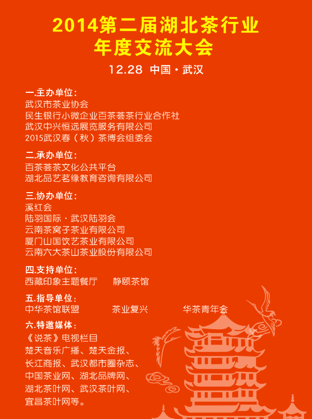 我们热诚欢迎各界人士届时莅会交流、学习,品茗、赏艺。祝第二届湖北茶行业年度交流大会取得圆满成功!祝大家身体健康!万事如意!谢谢!