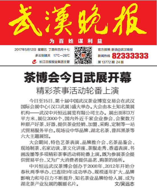武汉晚报:茶博会今日武展开幕 精彩茶事活动轮番上演