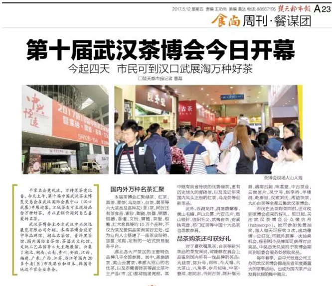 第10届春季武汉茶博会已完美收官,感谢各方的关注与支持,2017秋季武汉茶博会将于11月3日—6日汉口武展精彩再续,品茗、闻香、赏器,我们再相聚。