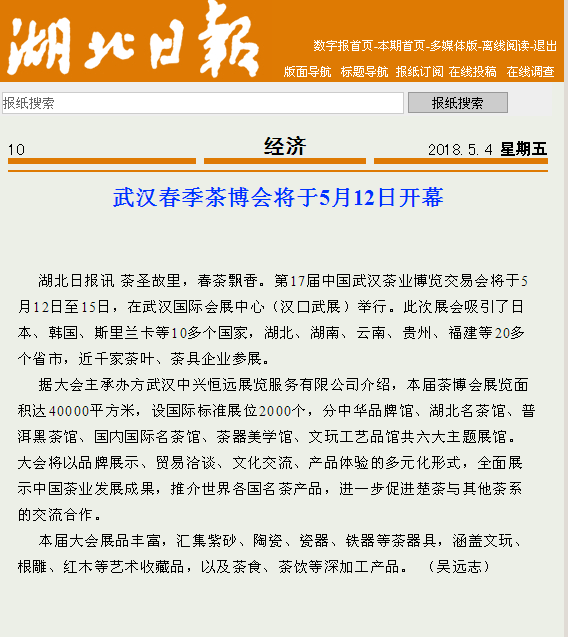 湖北日报:武汉春季茶博会将于5月12日开幕